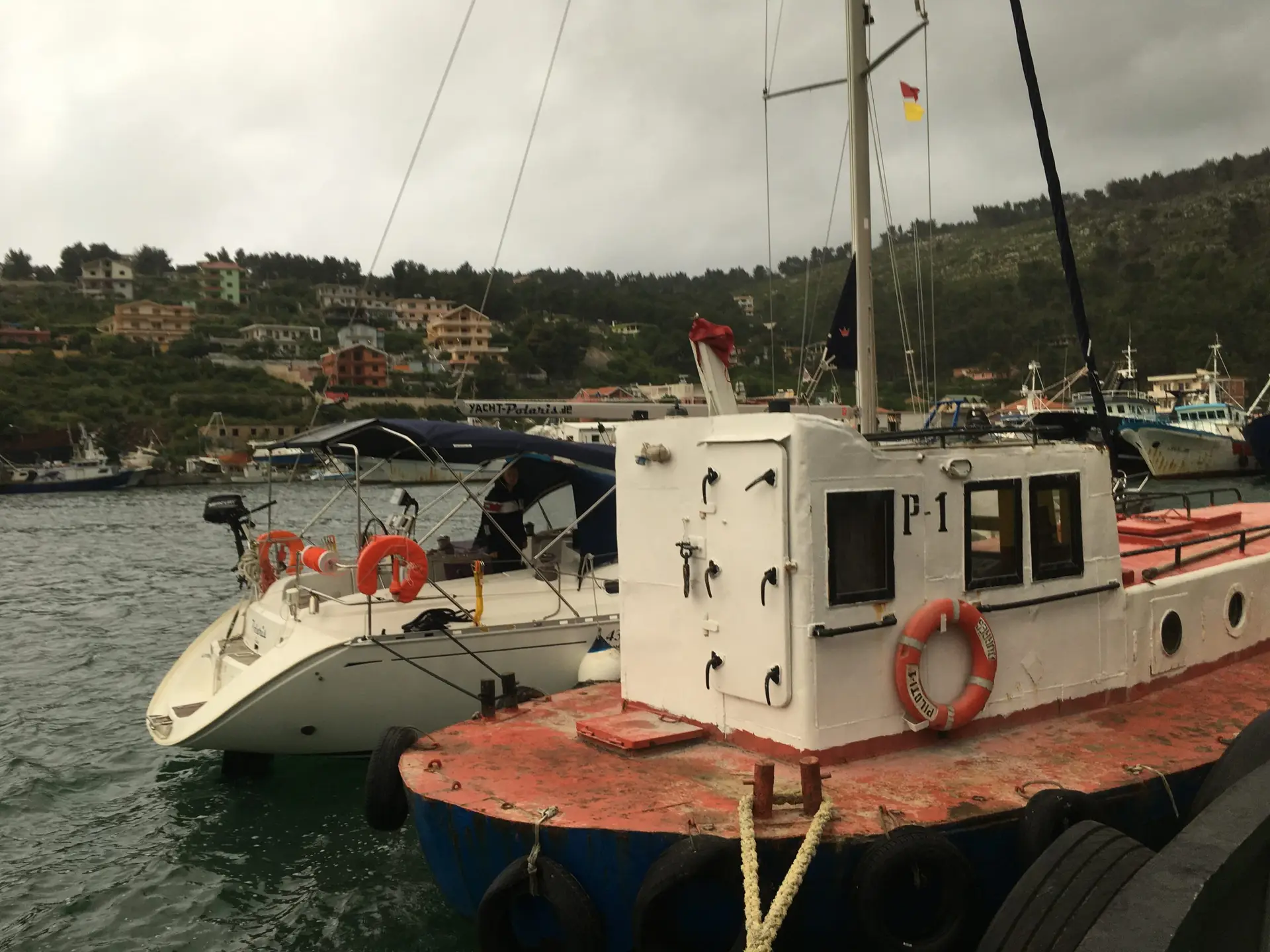 Wir passierten die Hafeneinfahrt von Shengjin, die bei südlichem Wind keinerlei Schutz bietet. Im Hafen selbst lagen ausschließlich Arbeitsboote – teils schwimmend, teils auf Grund. Die wenigen, die noch Wasser unterm Kiel hatten, wirkten längst ausgedient. An einem Steg lagen zwei größere Schiffe im Päckchen.