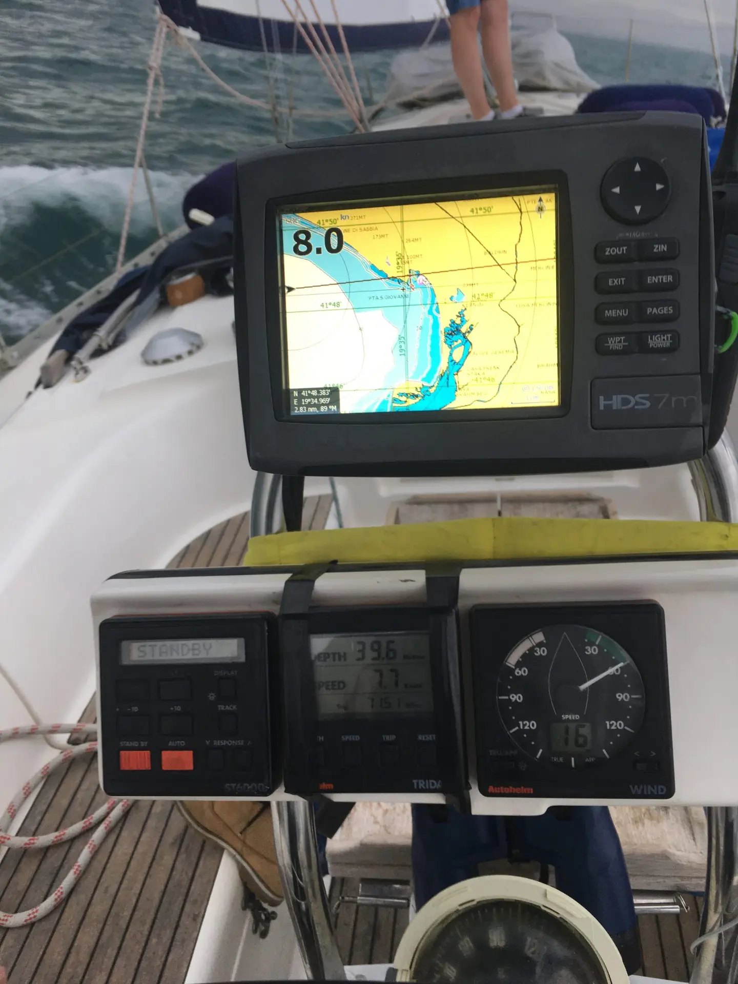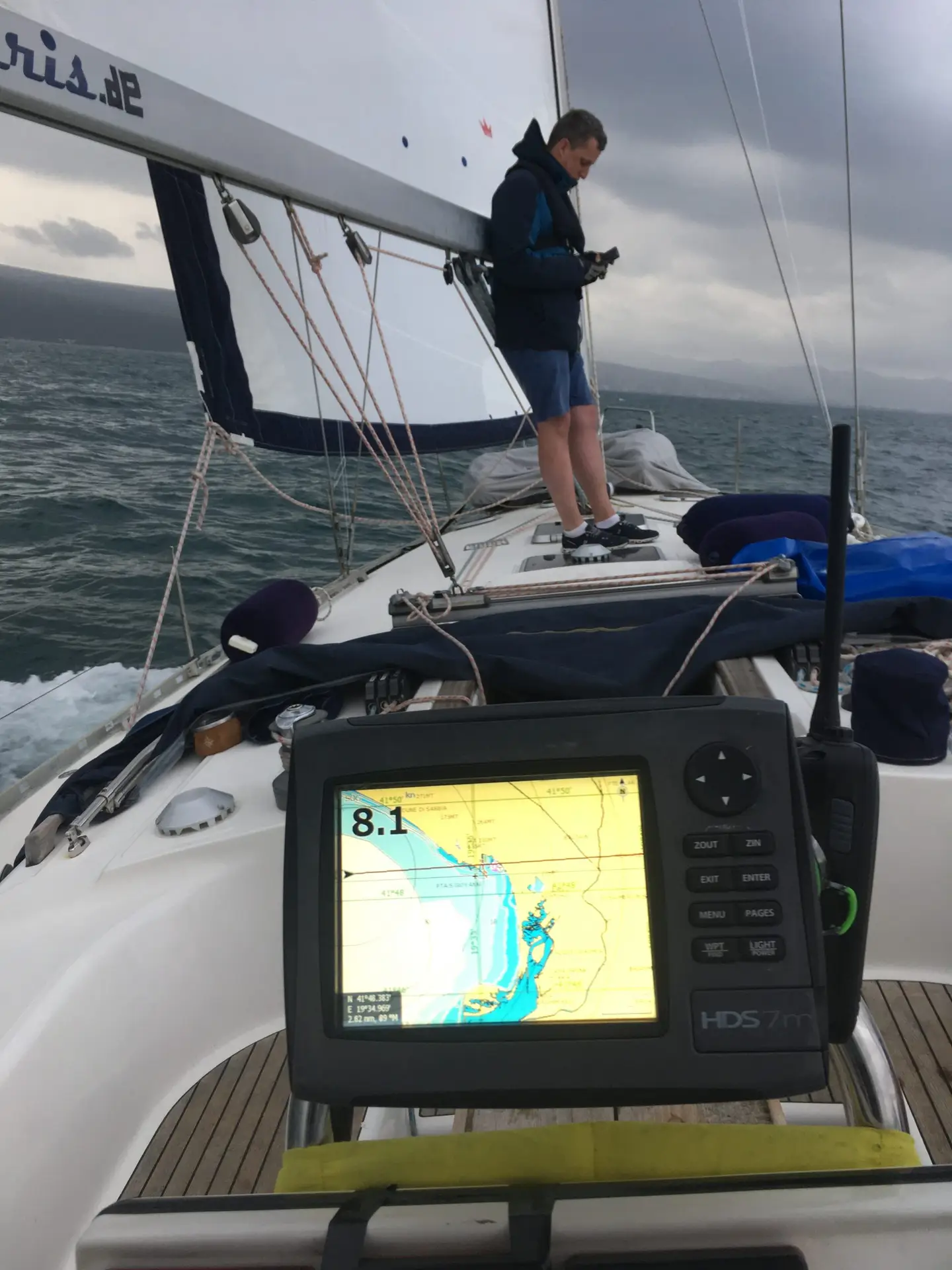 Segelboot mit Instrumentenbrett und Kartenplotter. Zu Sehen: Albanien nähe Shengjin