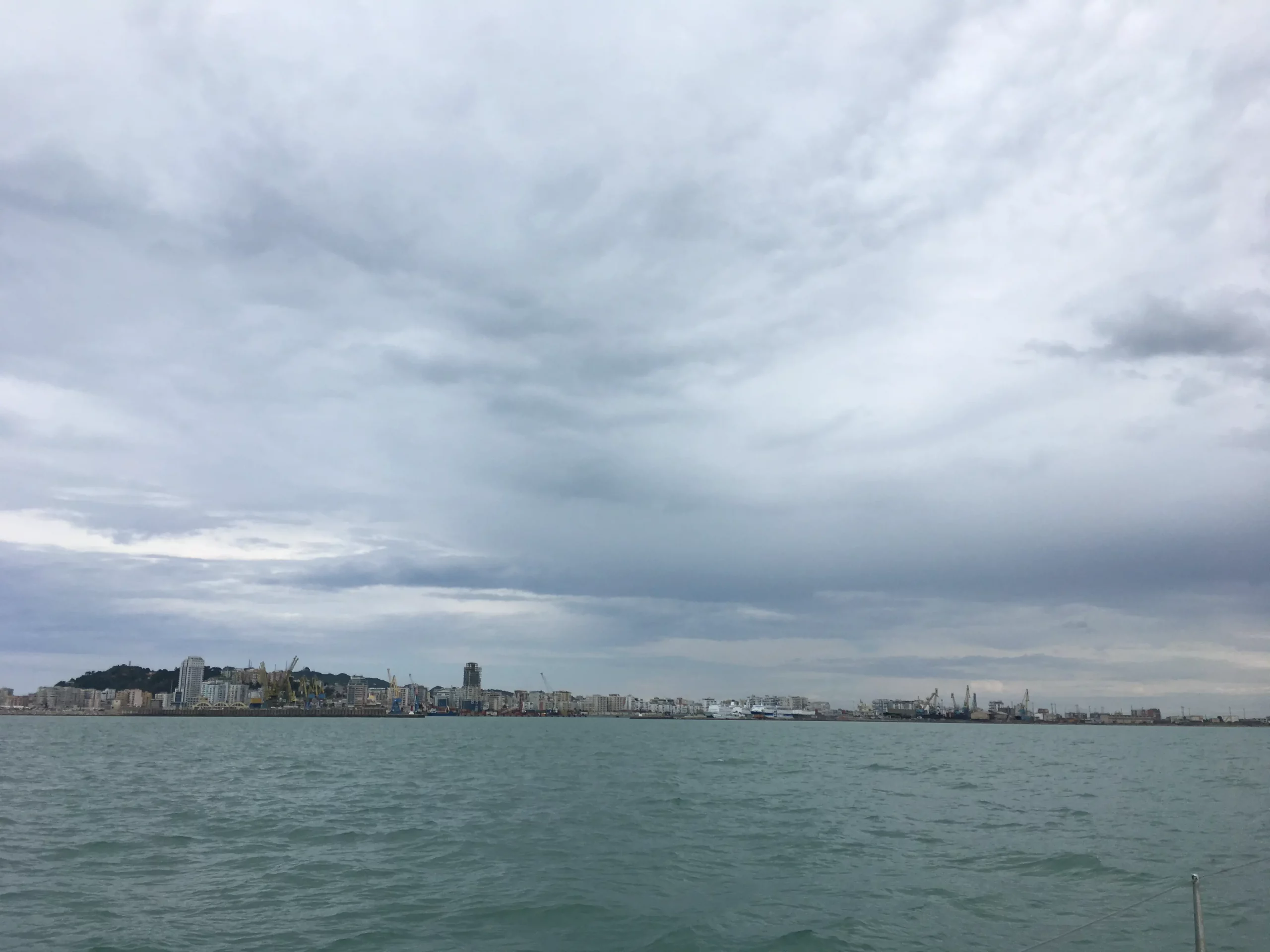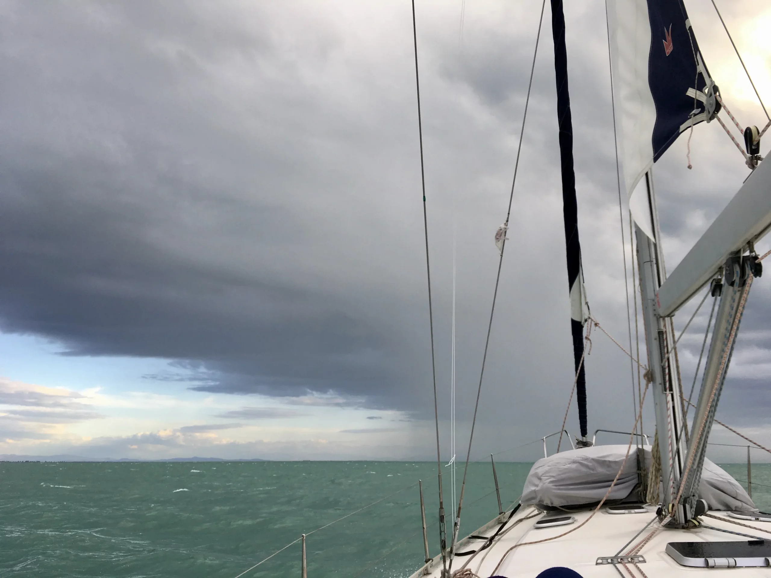 Der Wind frischte rasch auf, genau wie angekündigt: aus Süd. Da die Küste zunächst grob östlich verlief, konnten wir etwa zwanzig Meilen hart am Wind segeln. Der Himmel war bedeckt, immer wieder setzte Regen ein. Bei bis zu zwanzig Knoten wahrem Wind machten wir gute Fahrt. Die Yacht krängte, lief jedoch trotz hoher Wellen wie auf Schienen – ohne zu stampfen. Aus den Cockpit-Lautsprechern dudelte albanisches Radio: gute Musik, wenig Moderation. Nur „Last Christmas“ im Mai irritierte kurz.