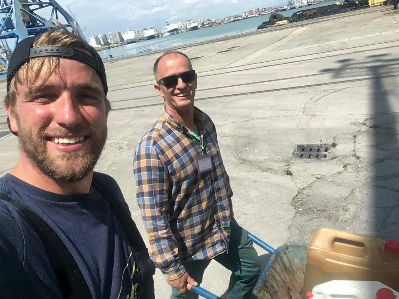 Da wir mit dem PKW das Gelände des gut gesicherten Industriehafens nicht befahren durften, mussten wir die letzten hundert Meter mit den vollen Kanistern zu Fuß zurücklegen. Eine Hafenmitarbeiterin bemerkte offenbar unser mühsames Schleppen – und kam zügig mit einer Schubkarre zur Hilfe.