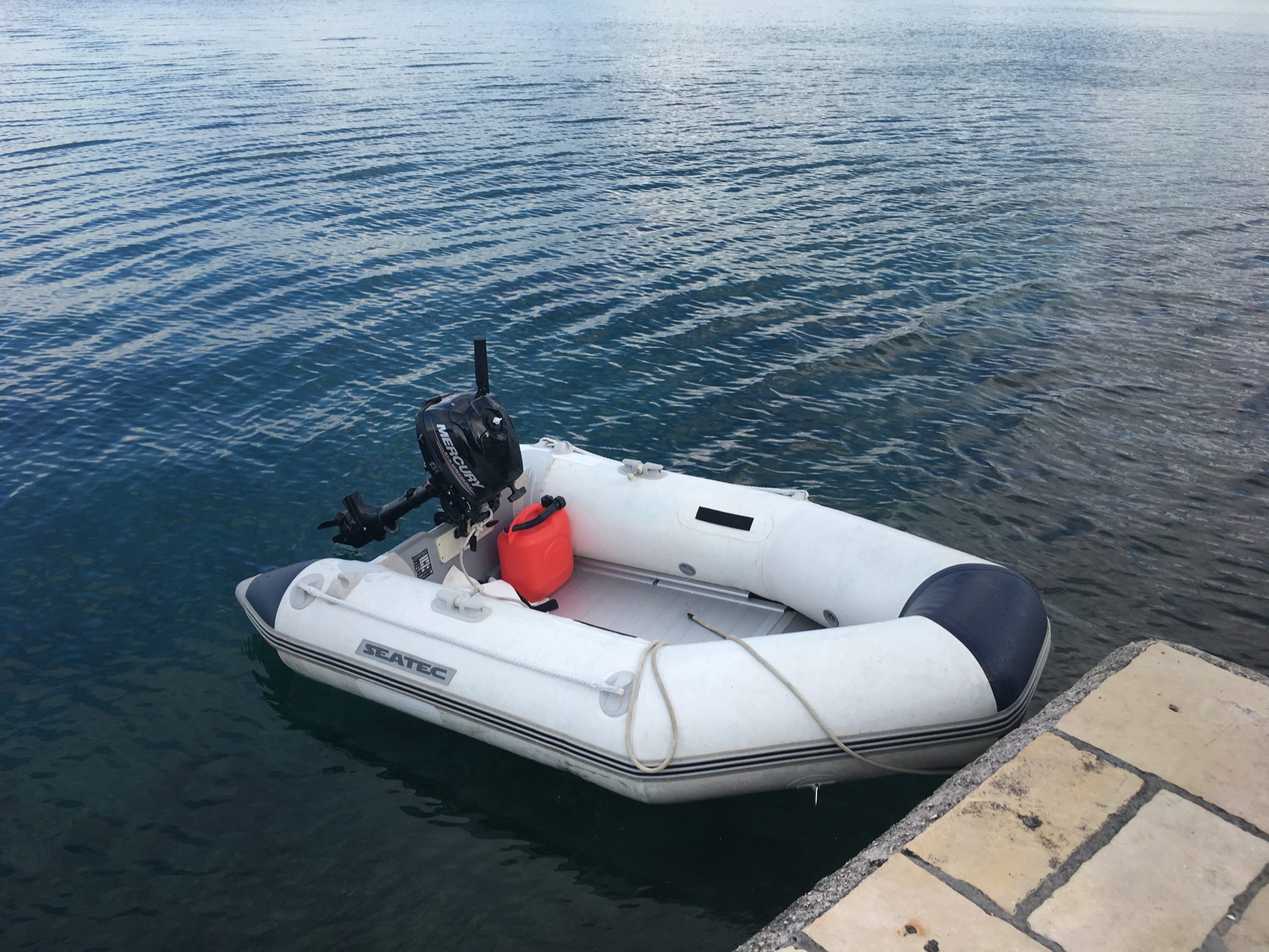 Ein Dinghi an einer Kaimauer in Korfu. Ein Kanister (Benzin) im Rumpf, ein Außenborder am Heck.