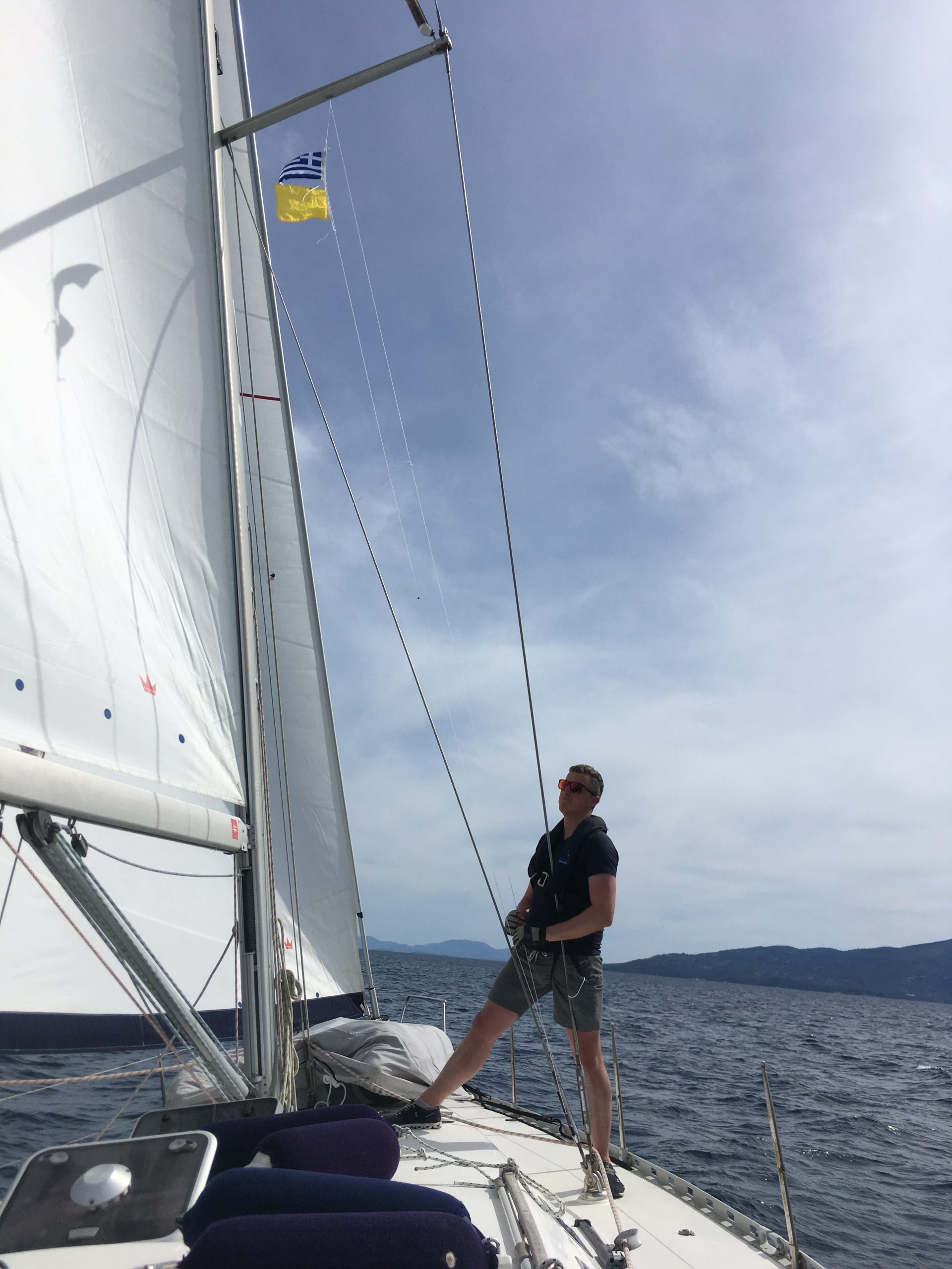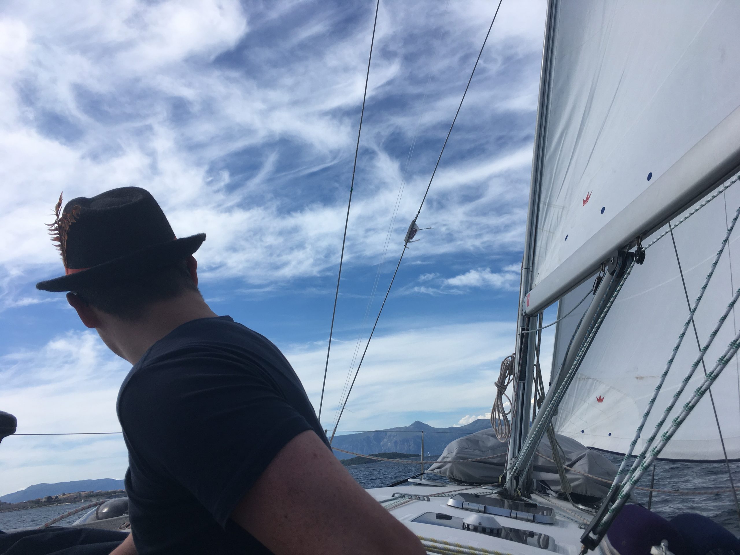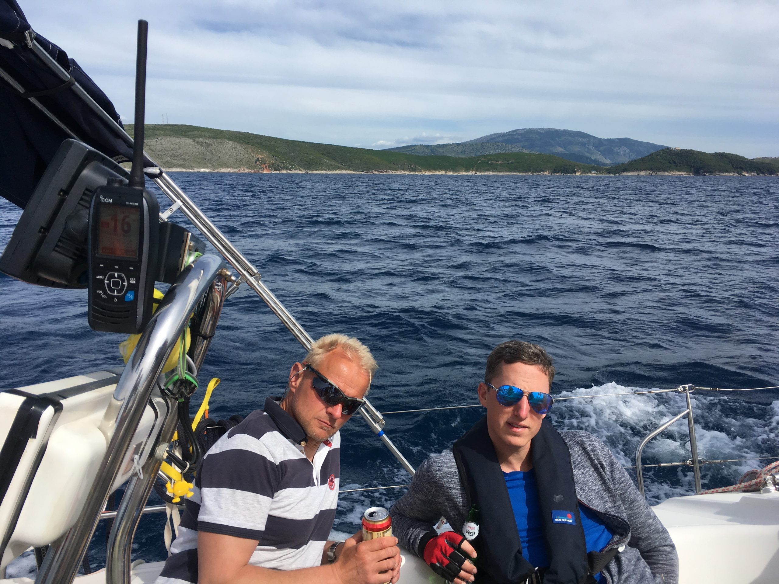 Von der albanischen Hafenstadt Sarandë bis zur Marina Gouvia auf Korfu sind es etwa fünfzehn Seemeilen. Rasmus war uns hold: Wir konnten mit einem wunderbaren Halbwind bei herrlichem Sonnenschein die Überführung abschließen. Nachdem wir die Hoheitsgewässer Griechenlands erreichten, setzten wir die blau-weiß karierte griechische Flagge und darunter den gelben Stoff. Wir spielten „Syrtaki“ über unsere Cockpitlautsprecher und tanzten dazu auf dem Vordeck: linkes Bein, rechtes Bein.