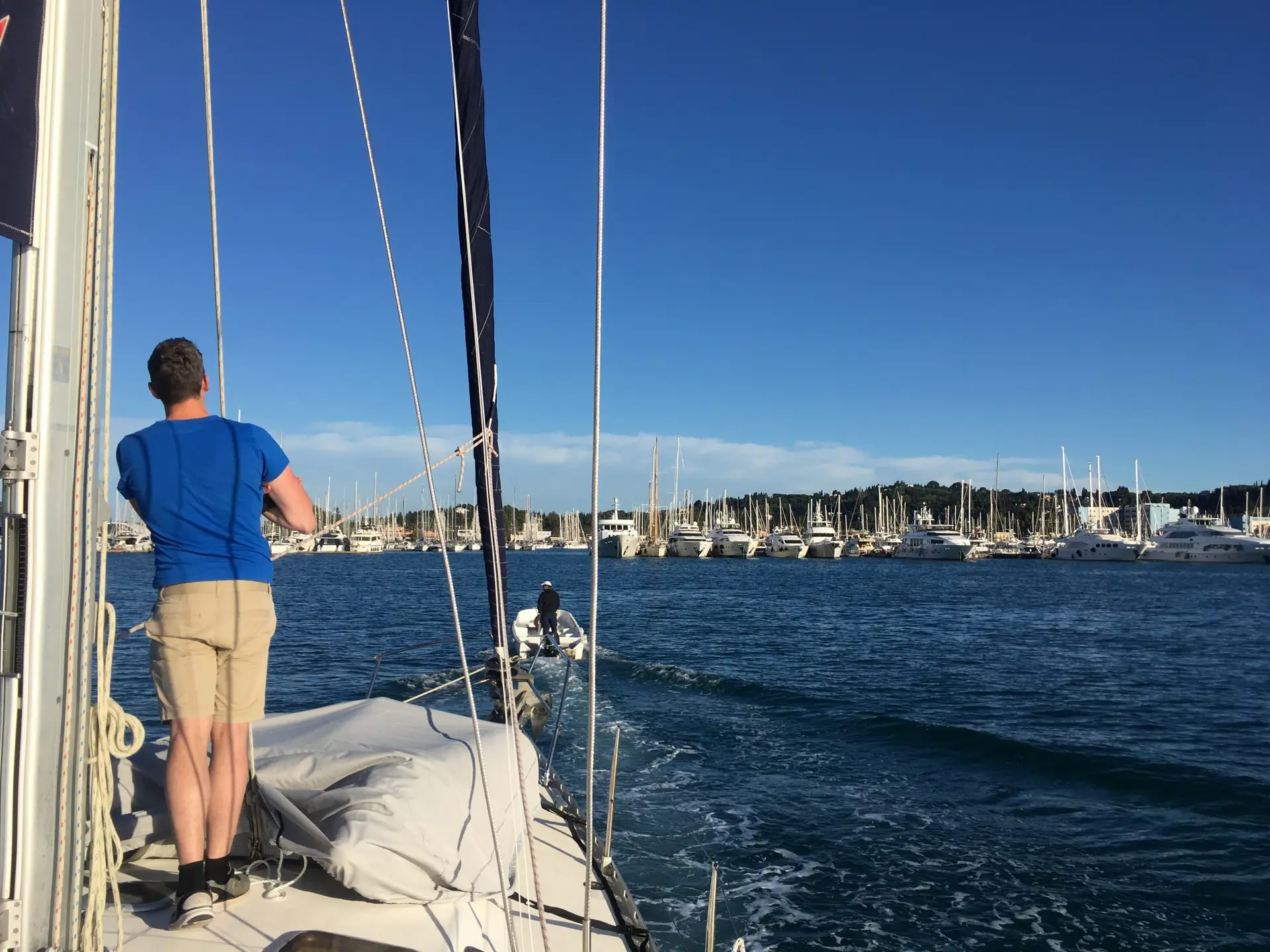 Am nächsten Morgen vernahm ich im Halbschlaf das Anlassen des Außenborders unseres Beiboots – und das kurz darauf folgende Verrecken. Ich stand auf, stellte mich in den Niedergang und sah meinen Co-Skipper im Dingi mit einem Teil der Crew. Nach ein paar erfolglosen Anlassversuchen später klärte mich das auf der Yacht zurückgebliebene Crewmitglied darüber auf, dass sie Frühstück holen und mich nicht wecken wollten. Eine schöne Geste! Ich schätze meinen Schlaf.