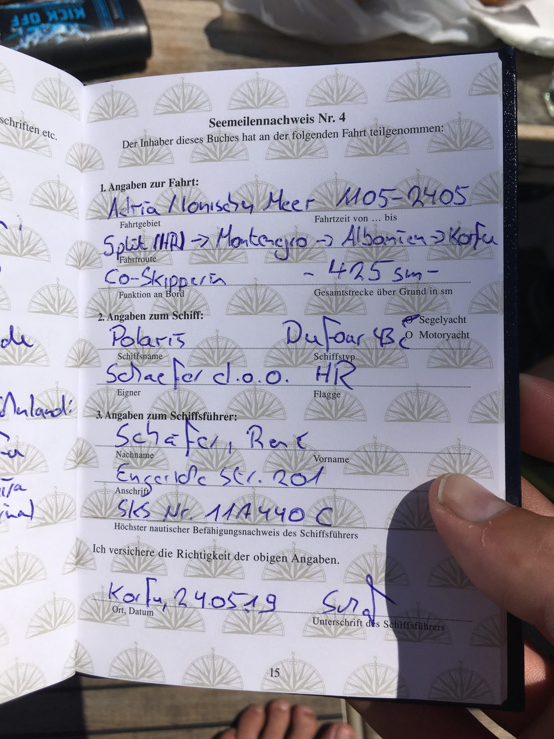 Meilenbuch eines Crewmitglieds. Eintragung der Strecke Kroatien - Korfu